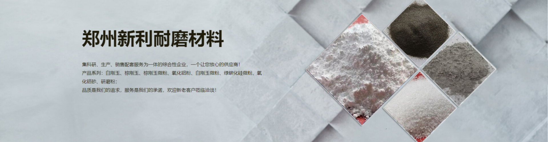 鄭州新利耐磨材料有限公司主要產(chǎn)品:包含白剛玉砂、白剛玉微粉、棕剛玉、棕剛玉微粉、 綠碳化硅微粉、氧化鋁砂、氧化鋁粉、研磨粉等多系列產(chǎn)品,為客戶提供豐富的產(chǎn)品型號及加工定制服務...